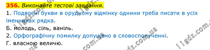 Виконайте тестові завдання. 1. Подвоєні букви в орудному відмінку однини треба писати в усіх іменниках рядка. Б. молодь, сіль, ваніль. 2. Орфографічну помилку допущено в словосполученні. Г. власною величю.