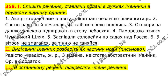 І. Спишіть речення, ставлячи подані в дужках іменники в орудному відмінку однини. 1. Акації стояли саме в цвіту, заквітчані безліччю білих китиць. 2. Своєю радістю й печаллю, як хлібом–сіллю поділись. 3. Осокори за даллю далекою підпирають в степу небосхил. 4. Памороззю взявся Чумацький Шлях. 5. Заспівали соловейки по садах над Россю. 6. З вітром не змагайся, за тінню не ганяйся. II. Виділений іменник розберіть як частину мови (письмово). Радістю – радість, ж. р., 3 відміна, неістота, абстрактний іменник, Ор. в., додаток. III. В останньому реченні підкресліть члени речення.