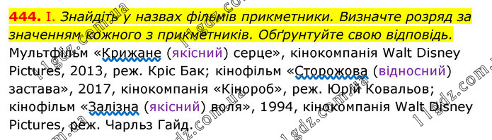 І. Знайдіть у назвах фільмів прикметники. Визначте розряд за значенням кожного з прикметників. Обґрунтуйте свою відповідь. Мультфільм «Крижане (якісний) серце», кінокомпанія Walt Disney Pictures, 2013, реж. Кріс Бак; кінофільм «Сторожова (відносний) застава», 2017, кінокомпанія «Кінороб», реж. Юрій Ковальов; кінофільм «Залізна (якісний) воля», 1994, кінокомпанія Walt Disney Pictures, реж. Чарльз Гайд.
