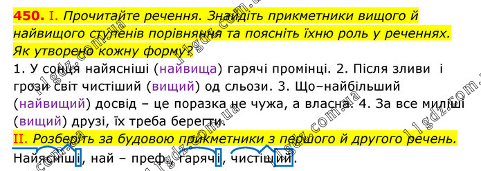 І. Прочитайте речення. Знайдіть прикметники вищого й найвищого ступенів порівняння та поясніть їхню роль у реченнях. Як утворено кожну форму? 1. У сонця найясніші (найвища) гарячі промінці. 2. Після зливи і грози світ чистіший (вищий) од сльози. 3. Що–найбільший (найвищий) досвід – це поразка не чужа, а власна. 4. За все миліші (вищий) друзі, їх треба берегти. II. Розберіть за будовою прикметники з першого й другого речень. Найясніші, най – преф., гарячі, чистіший.