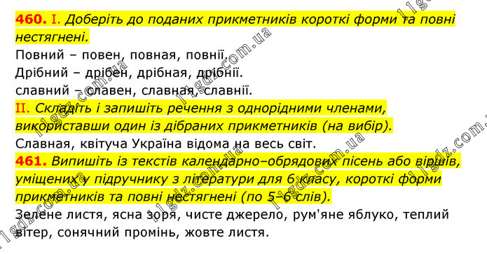 460. І. Доберіть до поданих прикметників короткі форми та повні нестягнені. Повний – повен, повная, повнії. Дрібний – дрібен, дрібная, дрібнії. славний – славен, славная, славнії. II. Складіть і запишіть речення з однорідними членами, використавши один із дібраних прикметників (на вибір). Славная, квітуча Україна відома на весь світ. 461. Випишіть із текстів календарно–обрядових пісень або віршів, уміщених у підручнику з літератури для 6 класу, короткі форми прикметників та повні нестягнені (по 5–6 слів). Зелене листя, ясна зоря, чисте джерело, рум'яне яблуко, теплий вітер, сонячний промінь, жовте листя.