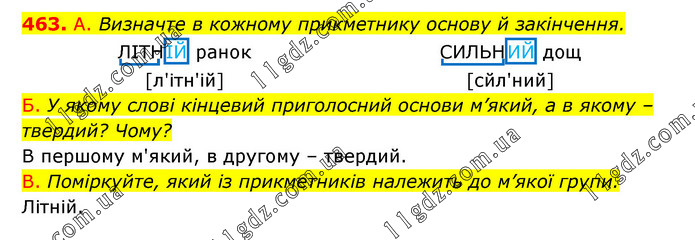 А. Визначте в кожному прикметнику основу й закінчення. ЛІТНІЙ ранок [л'ітн'ій] СИЛЬНИЙ дощ [сйл'ний] Б. У якому слові кінцевий приголосний основи м’який, а в якому – твердий? Чому? В першому м'який, в другому – твердий. В. Поміркуйте, який із прикметників належить до м’якої групи. Літній.