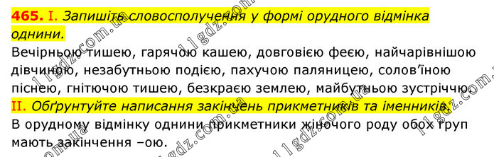 І. Запишіть словосполучення у формі орудного відмінка однини. Вечірньою тишею, гарячою кашею, довговією феєю, найчарівнішою дівчиною, незабутньою подією, пахучою паляницею, солов’їною піснею, гнітючою тишею, безкраєю землею, майбутньою зустріччю. II. Обґрунтуйте написання закінчень прикметників та іменників. В орудному відмінку однини прикметники жіночого роду обох груп мають закінчення –ою.