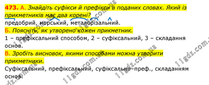 А. Знайдіть суфікси й префікси в поданих словах. Який із прикметників має два корені? предобрий, морський, металорізальний. Б. Поясніть, як утворено кожен прикметник. 1 – префіксальний способом, 2 – суфіксальний, 3 – складання основ. В. Зробіть висновок, якими способами можна утворити прикметники. Суфіксальний, префіксальний, суфіксально–преф., складанням основ.