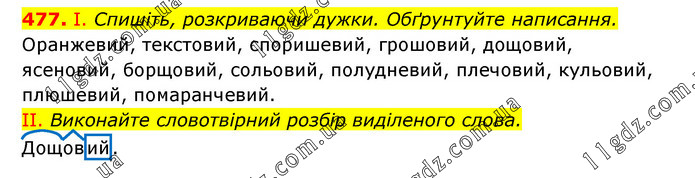 І. Спишіть, розкриваючи дужки. Обґрунтуйте написання. Оранжевий, текстовий, споришевий, грошовий, дощовий, ясеновий, борщовий, сольовий, полудневий, плечовий, кульовий, плюшевий, помаранчевий. II. Виконайте словотвірний розбір виділеного слова. Дощовий.