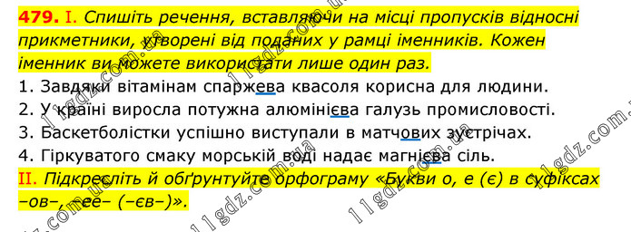 І. Спишіть речення, вставляючи на місці пропусків відносні прикметники, утворені від поданих у рамці іменників. Кожен іменник ви можете використати лише один раз. 1. Завдяки вітамінам спаржева квасоля корисна для людини. 2. У країні виросла потужна алюмінієва галузь промисловості. 3. Баскетболістки успішно виступали в матчових зустрічах. 4. Гіркуватого смаку морській воді надає магнієва сіль. II. Підкресліть й обґрунтуйте орфограму «Букви о, е (є) в суфіксах –ов–, –ее– (–єв–)».