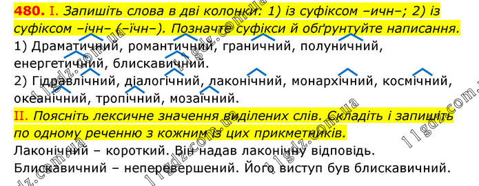 І. Запишіть слова в дві колонки: 1) із суфіксом –ичн–; 2) із суфіксом –ічн– (–їчн–). Позначте суфікси й обґрунтуйте написання. 1) Драматичний, романтичний, граничний, полуничний, енергетичний, блискавичний. 2) Гідравлічний, діалогічний, лаконічний, монархічний, космічний, океанічний, тропічний, мозаїчний. II. Поясніть лексичне значення виділених слів. Складіть і запишіть по одному реченню з кожним із цих прикметників. Лаконічний – короткий. Він надав лаконічну відповідь. Блискавичний – неперевершений. Його виступ був блискавичний.