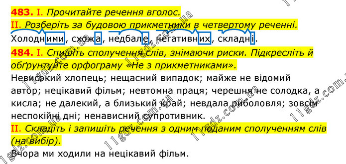 483. І. Прочитайте речення вголос. II. Розберіть за будовою прикметники в четвертому реченні. Холодними, схожа, недбале, негативних, складні. 484. І. Спишіть сполучення слів, знімаючи риски. Підкресліть й обґрунтуйте орфограму «Не з прикметниками». Невисокий хлопець; нещасний випадок; майже не відомий автор; нецікавий фільм; невтомна праця; черешня не солодка, а кисла; не далекий, а близький край; невдала риболовля; зовсім неспокійні дні; ненависний супротивник. II. Складіть і запишіть речення з одним поданим сполученням слів (на вибір). Вчора ми ходили на нецікавий фільм.