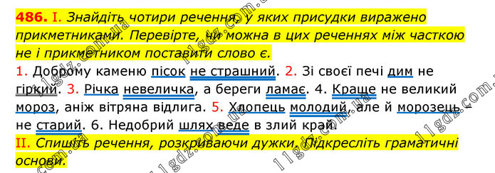 І. Знайдіть чотири речення, у яких присудки виражено прикметниками. Перевірте, чи можна в цих реченнях між часткою не і прикметником поставити слово є. 1. Доброму каменю пісок не страшний. 2. Зі своєї печі дим не гіркий. 3. Річка невеличка, а береги ламає. 4. Краще не великий мороз, аніж вітряна відлига. 5. Хлопець молодий, але й морозець – не старий. 6. Недобрий шлях веде в злий край. II. Спишіть речення, розкриваючи дужки. Підкресліть граматичні основи.