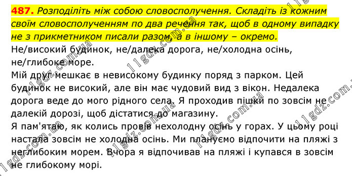 Розподіліть між собою словосполучення. Складіть із кожним своїм словосполученням по два речення так, щоб в одному випадку не з прикметником писали разом, а в іншому – окремо. Не/високий будинок, не/далека дорога, не/холодна осінь, не/глибоке море. Мій друг мешкає в невисокому будинку поряд з парком. Цей будинок не високий, але він має чудовий вид з вікон. Недалека дорога веде до мого рідного села. Я проходив пішки по зовсім не далекій дорозі, щоб дістатися до магазину. Я пам'ятаю, як колись провів нехолодну осінь у горах. У цьому році настала зовсім не холодна осінь. Ми плануємо відпочити на пляжі з неглибоким морем. Вчора я відпочивав на пляжі і купався в зовсім не глибокому морі.