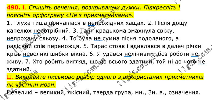 І. Спишіть речення, розкриваючи дужки. Підкресліть і поясніть орфограму «Не з прикметниками». 1. Глуха тиша причаїлася в непрохідних хащах. 2. Після дощу капелюх непотрібний. 3. Таня крадькома змахнула свіжу, непрохану сльозу. 4. То була не сумна пісня подоланого, а радісний спів переможця. 5. Тарас стояв і вдивлявся в далеч річки крізь невеликі шибки вікна. 6. Я удався нелінивим, без роботи не живу. 7. Хто робить вигляд, що до всього здатний, той ні до чого не здатний. II. Виконайте письмово розбір одного з використаних прикметників як частини мови. Невеликі – великий, якісний, тверда група, мн., Зн. в., означення.