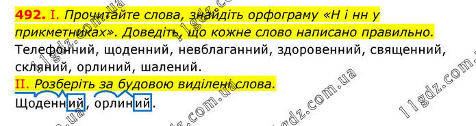 І. Прочитайте слова, знайдіть орфограму «Н і нн у прикметниках». Доведіть, що кожне слово написано правильно. Телефонний, щоденний, невблаганний, здоровенний, священний, скляний, орлиний, шалений. II. Розберіть за будовою виділені слова. Щоденний, орлиний.
