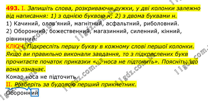 І. Запишіть слова, розкриваючи дужки, у дві колонки залежно від написання: 1) з однією буквою н; 2) з двома буквами н. 1) Качиний, олов’яний, магнітний, асфальтний, риболовний. 2) Оборонний, божественний, магазинний, силенний, кінний, рівнинний. КЛЮЧ. Підкресліть першу букву в кожному слові першої колонки. Якщо ви правильно виконали завдання, то з підкреслених букв прочитаєте початок приказки «... носа не підточить». Поясніть, що вона означає. Комар носа не підточить. II. Розберіть за будовою перший прикметник. Оборонний
