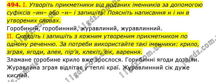 І. Утворіть прикметники від поданих іменників за допомогою суфіксів –ин– або –н– і запишіть. Поясніть написання н і нн в утворених словах. Горобиний, горобинний, журавлиний, журавлинний. ІІ. Складіть і запишіть з кожним утвореним прикметником по одному реченню. За потреби використайте такі іменники: крило, зграя, ягоди, алея, пір’я, клекіт, сік, варення. Зламане горобине крило вже зрослося. Горибинні ягоди дозріли. Журавлина зграя відлітає у теплі краї. Журавлинний сік дуже кислий.