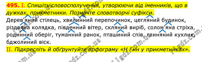 І. Спишіть словосполучення, утворюючи від іменників, що в дужках, прикметники. Позначте словотворчі суфікси. Дерев'яний стілець, хвилинний перепочинок, цегляний будинок, різдвяна колядка, південний вітер, скляний виріб, солом'яна стріха, родинний оберіг, туманний ранок, пташиний спів, глиняний кухлик, бджолиний віск. II. Підкресліть й обґрунтуйте орфограму «Н і нн у прикметниках».