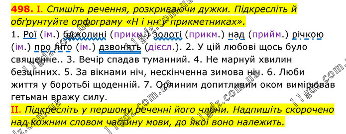 І. Спишіть речення, розкриваючи дужки. Підкресліть й обґрунтуйте орфограму «Н і нн у прикметниках». 1. Рої (ім.) бджолині (прикм.) золоті (прикм.) над (прийм.) річкою (ім.) про літо (ім.) дзвонять (дієсл.). 2. У цій любові щось було священне.. 3. Вечір спадав туманний. 4. Не марнуй хвилин безцінних. 5. За вікнами ніч, нескінченна зимова ніч. 6. Люби життя у боротьбі щоденній. 7. Орлиним допитливим оком вимірював гетьман вражу силу. II. Підкресліть у першому реченні його члени. Надпишіть скорочено над кожним словом частину мови, до якої воно належить.