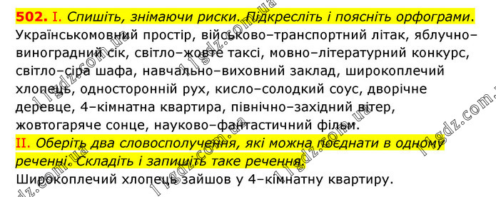 І. Спишіть, знімаючи риски. Підкресліть і поясніть орфограми. Українськомовний простір, військово–транспортний літак, яблучно– виноградний сік, світло–жовте таксі, мовно–літературний конкурс, світло–сіра шафа, навчально–виховний заклад, широкоплечий хлопець, односторонній рух, кисло–солодкий соус, дворічне деревце, 4–кімнатна квартира, північно–західний вітер, жовтогаряче сонце, науково–фантастичний фільм. II. Оберіть два словосполучення, які можна поєднати в одному реченні. Складіть і запишіть таке речення. Широкоплечий хлопець зайшов у 4–кімнатну квартиру.