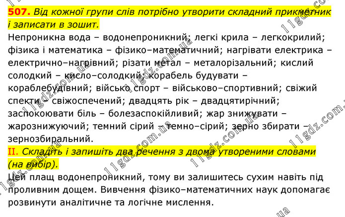 Від кожної групи слів потрібно утворити складний прикметник і записати в зошит. Непроникна вода – водонепроникний; легкі крила – легкокрилий; фізика і математика – фізико–математичний; нагрівати електрика – електрично–нагрівний; різати метал – металорізальний; кислий солодкий – кисло–солодкий; корабель будувати – кораблебудівний; військо спорт – військово–спортивний; свіжий спекти – свіжоспечений; двадцять рік – двадцятирічний; заспокоювати біль – болезаспокійливий; жар знижувати – жарознижуючий; темний сірий – темно–сірий; зерно збирати – зернозбиральний. II. Складіть і запишіть два речення з двома утвореними словами (на вибір). Цей плащ водонепроникний, тому ви залишитесь сухим навіть під проливним дощем. Вивчення фізико–математичних наук допомагає розвинути аналітичне та логічне мислення.