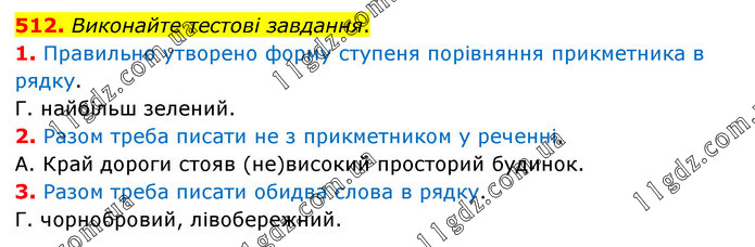 Виконайте тестові завдання. 1. Правильно утворено форму ступеня порівняння прикметника в рядку. Г. найбільш зелений. 2. Разом треба писати не з прикметником у реченні. А. Край дороги стояв (не)високий просторий будинок. 3. Разом треба писати обидва слова в рядку. Г. чорнобровий, лівобережний.