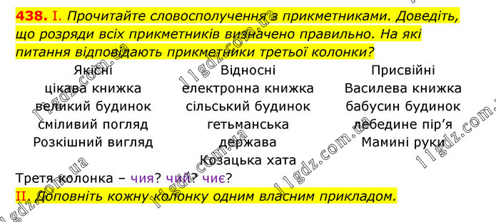 І. Прочитайте словосполучення з прикметниками. Доведіть, що розряди всіх прикметників визначено правильно. На які питання відповідають прикметники третьої колонки? Якісні цікава книжка великий будинок сміливий погляд Розкішний вигляд Відносні електронна книжка сільський будинок гетьманська держава Козацька хата Присвійні Василева книжка бабусин будинок лебедине пір’я Мамині руки Третя колонка – чия? чий? чиє? II. Доповніть кожну колонку одним власним прикладом.
