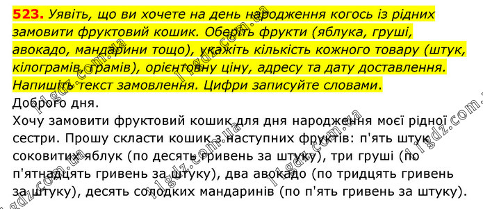 Уявіть, що ви хочете на день народження когось із рідних замовити фруктовий кошик. Оберіть фрукти (яблука, груші, авокадо, мандарини тощо), укажіть кількість кожного товару (штук, кілограмів, грамів), орієнтовну ціну, адресу та дату доставлення. Напишіть текст замовлення. Цифри записуйте словами. Доброго дня. Хочу замовити фруктовий кошик для дня народження моєї рідної сестри. Прошу скласти кошик з наступних фруктів: п'ять штук соковитих яблук (по десять гривень за штуку), три груші (по п'ятнадцять гривень за штуку), два авокадо (по тридцять гривень за штуку), десять солодких мандаринів (по п'ять гривень за штуку).