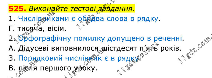 Виконайте тестові завдання. 1. Числівниками є обидва слова в рядку. Г. тисяча, вісім. 2. Орфографічну помилку допущено в реченні. А. Дідусеві виповнилося шістдесят п’ять років. 3. Порядковий числівник є в рядку. В. після першого уроку.