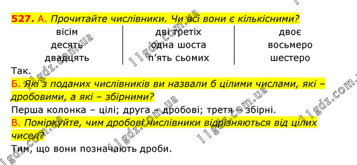 А. Прочитайте числівники. Чи всі вони є кількісними? вісім десять двадцять дві третіх одна шоста п’ять сьомих двоє восьмеро шестеро Так. Б. Які з поданих числівників ви назвали б цілими числами, які – дробовими, а які – збірними? Перша колонка – цілі; друга – дробові; третя – збірні. В. Поміркуйте, чим дробові числівники відрізняються від цілих чисел? Тим, що вони позначають дроби.