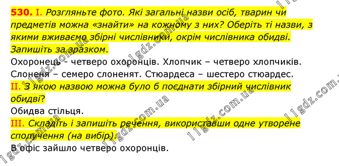 І. Розгляньте фото. Які загальні назви осіб, тварин чи предметів можна «знайти» на кожному з них? Оберіть ті назви, з якими вживаємо збірні числівники, окрім числівника обидві. Запишіть за зразком. Охоронець - четверо охоронців. Хлопчик – четверо хлопчиків. Слоненя – семеро слоненят. Стюардеса – шестеро стюардес. II. З якою назвою можна було б поєднати збірний числівник обидві? Обидва стільця. III. Складіть і запишіть речення, використавши одне утворене сполучення (на вибір). В офіс зайшло четверо охоронців.