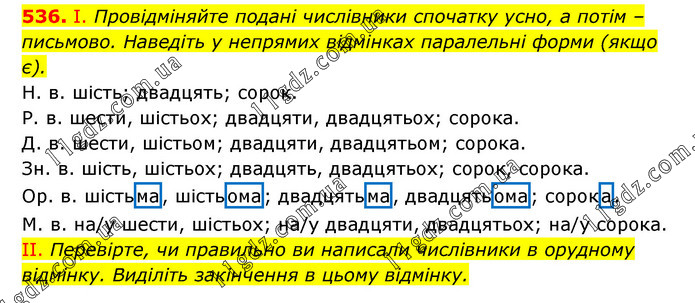І. Провідміняйте подані числівники спочатку усно, а потім – письмово. Наведіть у непрямих відмінках паралельні форми (якщо є). Н. в. шість; двадцять; сорок. Р. в. шести, шістьох; двадцяти, двадцятьох; сорока. Д. в. шести, шістьом; двадцяти, двадцятьом; сорока. Зн. в. шість, шістьох; двадцять, двадцятьох; сорок, сорока. Ор. в. шістьма, шістьома; двадцятьма, двадцятьома; сорока. М. в. на/у шести, шістьох; на/у двадцяти, двадцятьох; на/у сорока. II. Перевірте, чи правильно ви написали числівники в орудному відмінку. Виділіть закінчення в цьому відмінку.