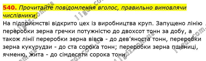 Прочитайте повiдомлення вголос, правильно вимовлячи числiвники. На пiдприємствi вiдкрито цех iз виробництва круп. Запущено лiнiю переробки зерна гречки потужнiстю до двохсот тонн за добу, а також лiнії переробки зерна вiвса - до дев’яноста тонн, переробки зерна кукурудзи - до ста сорока тонн; переробки зерна пшеницi, ячменю, жита - до сімдесяти сорока тонн.