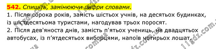 Спишіть, замінюючи цифри словами. 1. Після сорока років, замість шістьох учнів, на десятьох будинках, із шістдесятьома туристами, нагодував трьох поросят. 2. Після дев'яноста днів, замість п'ятьох учениць, на двадцятьох автобусах, із п’ятдесятьох виборцями, напоїв чотирьох лошат.