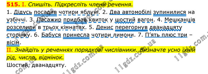 І. Спишіть. Підкресліть члени речення. 1. Дідусь посадив чотири яблуні. 2. Два автомобілі зупинилися на узбіччі. 3. Пасажир придбав квиток у шостий вагон. 4. Мешканців розселили в трьох кімнатах. 5. Денис перегорнув дванадцяту сторінку. 6. Бабуся принесла чотири лимони. 7. П’ять плюс три – вісім. II. Знайдіть у реченнях порядкові числівники. Визначте усно їхній рід, число, відмінок. Шостий, дванадцяту.