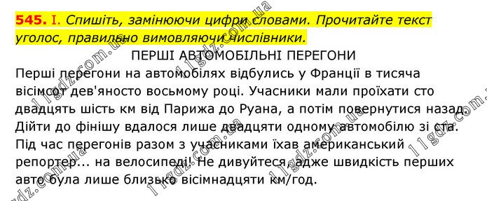 І. Спишіть, замінюючи цифри словами. Прочитайте текст уголос, правильно вимовляючи числівники. ПЕРШІ АВТОМОБІЛЬНІ ПЕРЕГОНИ Перші перегони на автомобілях відбулись у Франції в тисяча вісімсот дев'яносто восьмому році. Учасники мали проїхати сто двадцять шість км від Парижа до Руана, а потім повернутися назад. Дійти до фінішу вдалося лише двадцяти одному автомобілю зі ста. Під час перегонів разом з учасниками їхав американський репортер... на велосипеді! Не дивуйтеся, адже швидкість перших авто була лише близько вісімнадцяти км/год.