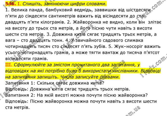 І. Спишіть, замінюючи цифри словами. 1. Велика панда, бамбуковий ведмідь, заввишки від шістдесяти п’яти до сімдесяти сантиметрів важить від вісімдесяти до ста двадцять п’яти кілограмів. 2. Жайворонка не видно, коли він злітає на висоту до трьох ста метрів, а його пісню чути навіть з висоти шести ста метрів. 3. Довжина китів сягає тридцять трьох метрів, а вага – сто двадцять тонн. 4. У звичайного садового слимака чотирнадцять тисяч сто сімдесят п’ять зубів. 5. Жук–носоріг важить усього чотирнадцять грамів, а може тягти вантаж до тисяча п’ятсот вісімдесяти грамів. III. Сформулюйте за змістом прочитаного два запитання, у відповідях на які потрібно було б використати числівники. Відповіді на запитання запишіть. Числа записуйте словами. Запитання 1: Скільки сягає довжина китів? Відповідь: Довжина китів сягає тридцять трьох метрів. Запитання 2: На якій висоті можна почути пісню жайворонка? Відповідь: Пісню жайворонка можна почути навіть з висоти шести ста метрів.