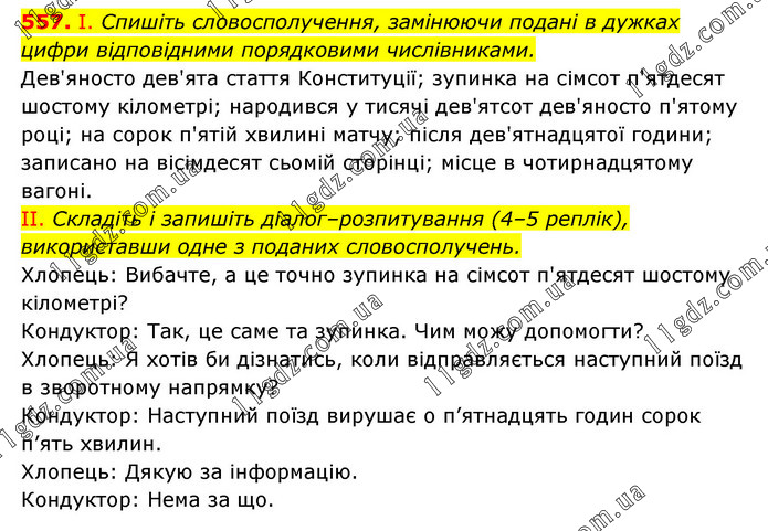 І. Спишіть словосполучення, замінюючи подані в дужках цифри відповідними порядковими числівниками. Дев'яносто дев'ята стаття Конституції; зупинка на сімсот п'ятдесят шостому кілометрі; народився у тисячі дев'ятсот дев'яносто п'ятому році; на сорок п'ятій хвилині матчу; після дев'ятнадцятої години; записано на вісімдесят сьомій сторінці; місце в чотирнадцятому вагоні. II. Складіть і запишіть діалог–розпитування (4–5 реплік), використавши одне з поданих словосполучень. Хлопець: Вибачте, а це точно зупинка на сімсот п'ятдесят шостому кілометрі? Кондуктор: Так, це саме та зупинка. Чим можу допомогти? Хлопець: Я хотів би дізнатись, коли відправляється наступний поїзд в зворотному напрямку? Кондуктор: Наступний поїзд вирушає о п’ятнадцять годин сорок п’ять хвилин. Хлопець: Дякую за інформацію. Кондуктор: Нема за що.