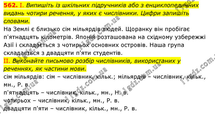 І. Випишіть із шкільних підручників або з енциклопедичних видань чотири речення, у яких є числівники. Цифри запишіть словами. На Землі є близько сім мільярдів людей. Щоранку він пробігає п'ятнадцять кілометрів. Японія розташована на східному узбережжі Азії і складається з чотирьох основних островів. Наша група складається з двадцяти п'яти студентів. II. Виконайте письмово розбір числівників, використаних у реченнях, як частини мови. сім мільярдів: сім – числівник, кільк.; мільярдів – числівник, кільк., мн., Р. в. п'ятнадцять – числівник, кільк., мн., Н. в. чотирьох – числівник, кільк., мн., Р. в. двадцяти п'яти – числівник, кільк., мн., Р. в.