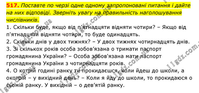 Поставте по черзі одне одному запропоновані питання і дайте на них відповіді. Зверніть увагу на правильність наголошування числівників. 1. Скільки буде, якщо від п’ятнадцяти відняти чотири? – Якщо від п'ятнадцяти відняти чотири, то буде одинадцять. 2. Скільки днів у двох тижнях? – У двох тижнях чотирнадцять днів. 3. Зі скількох років особа зобов’язана о тримати паспорт громадянина України? – Особа зобов'язана мати паспорт громадянина України з чотирнадцяти років. 4. О котрій годині ранку ти прокидаєшся, коли йдеш до школи, а о котрій – у вихідний день? – Коли я йду до школи, то прокидаюся о сьомій ранку. У вихідній – о дев’ятій ранку