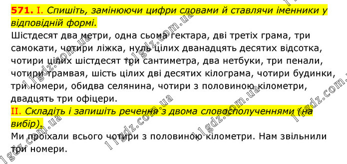 І. Спишіть, замінюючи цифри словами й ставлячи іменники у відповідній формі. Шістдесят два метри, одна сьома гектара, дві третіх грама, три самокати, чотири ліжка, нуль цілих дванадцять десятих відсотка, чотири цілих шістдесят три сантиметра, два нетбуки, три пенали, чотири трамвая, шість цілих дві десятих кілограма, чотири будинки, три номери, обидва селянина, чотири з половиною кілометри, двадцять три офіцери. II. Складіть і запишіть речення з двома словосполученнями (на вибір). Ми проїхали всього чотири з половиною кілометри. Нам звільнили три номери.