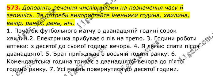 Доповніть речення числівниками на позначення часу й запишіть. За потреби використайте іменники година, хвилина, вечір, ранок, день, ніч. 1. Початок футбольного матчу о дванадцятій годині сорок хвилин.2. Електричка прибуває о пів на третю. 3. Години роботи аптеки: з десятої до сьомої години вечора. 4. Я лягаю спати після дванадцятої. 5. Брат приїжджає о восьмій годині ранку. 6. Комендантська година триває з дванадцятої вечора до п'ятої години ранку. 7. Усі мають повернутися до десятої години.