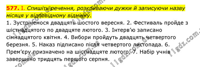 І. Спишіть речення, розкриваючи дужки й записуючи назву місяця у відповідному відмінку. 1. Зустрінемося двадцять шостого вересня. 2. Фестиваль пройде з шістнадцятого по двадцяте лютого. 3. Інтерв’ю записано сімнадцятого квітня. 4. Вибори пройдуть двадцять четвертого березня. 5. Наказ підписано після четвертого листопада. 6. Прем’єру призначено на шістнадцяте лютого. 7. Набір учнів завершено тридцять першого серпня.