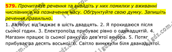 Прочитайте речення та знайдіть у них помилки у вживанні числівників на позначення часу. Обґрунтуйте свою думку. Запишіть речення правильно. 1. Автобус від’їжджає в шість двадцять. 2. Я прокидаюся після сьомої годин. 3. Електропоїзд прибуває рівно о одинадцятій. 4. Магазин працює із сьомої ранку до дев’ятої вечора. 5. Потяг прибуває за десять восьмої. 6. Світло вимкнули біля дванадцятої.