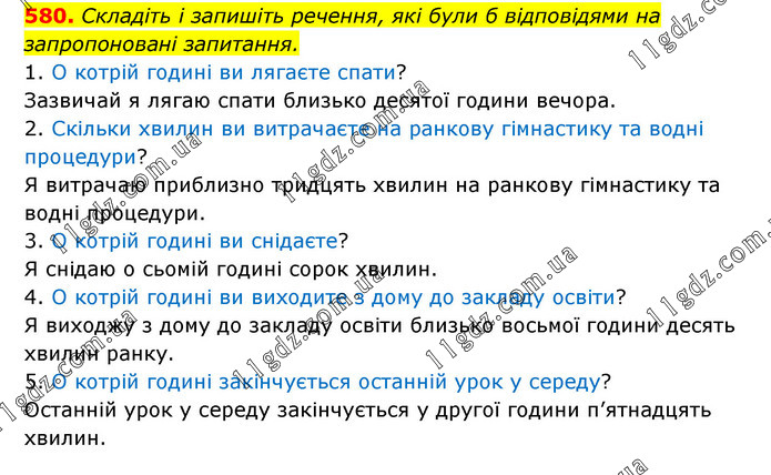 Складіть і запишіть речення, які були б відповідями на запропоновані запитання. 1. О котрій годині ви лягаєте спати? Зазвичай я лягаю спати близько десятої години вечора. 2. Скільки хвилин ви витрачаєте на ранкову гімнастику та водні процедури? Я витрачаю приблизно тридцять хвилин на ранкову гімнастику та водні процедури. 3. О котрій годині ви снідаєте? Я снідаю о сьомій годині сорок хвилин. 4. О котрій годині ви виходите з дому до закладу освіти? Я виходжу з дому до закладу освіти близько восьмої години десять хвилин ранку. 5. О котрій годині закінчується останній урок у середу? Останній урок у середу закінчується у другої години п’ятнадцять хвилин.
