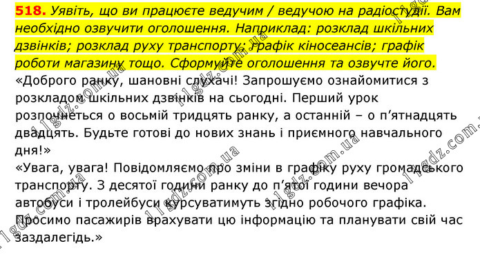 Уявіть, що ви працюєте ведучим / ведучою на радіостудії. Вам необхідно озвучити оголошення. Наприклад: розклад шкільних дзвінків; розклад руху транспорту; графік кіносеансів; графік роботи магазину тощо. Сформуйте оголошення та озвучте його. «Доброго ранку, шановні слухачі! Запрошуємо ознайомитися з розкладом шкільних дзвінків на сьогодні. Перший урок розпочнеться о восьмій тридцять ранку, а останній – о п’ятнадцять двадцять. Будьте готові до нових знань і приємного навчального дня!» «Увага, увага! Повідомляємо про зміни в графіку руху громадського транспорту. З десятої години ранку до п’ятої години вечора автобуси і тролейбуси курсуватимуть згідно робочого графіка. Просимо пасажирів врахувати цю інформацію та планувати свій час заздалегідь.»