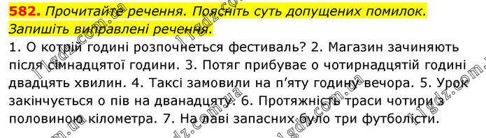 Прочитайте речення. Поясніть суть допущених помилок. Запишіть виправлені речення. 1. О котрій годині розпочнеться фестиваль? 2. Магазин зачиняють після сімнадцятої години. 3. Потяг прибуває о чотирнадцятій годині двадцять хвилин. 4. Таксі замовили на п’яту годину вечора. 5. Урок закінчується о пів на дванадцяту. 6. Протяжність траси чотири з половиною кілометра. 7. На лаві запасних було три футболісти.