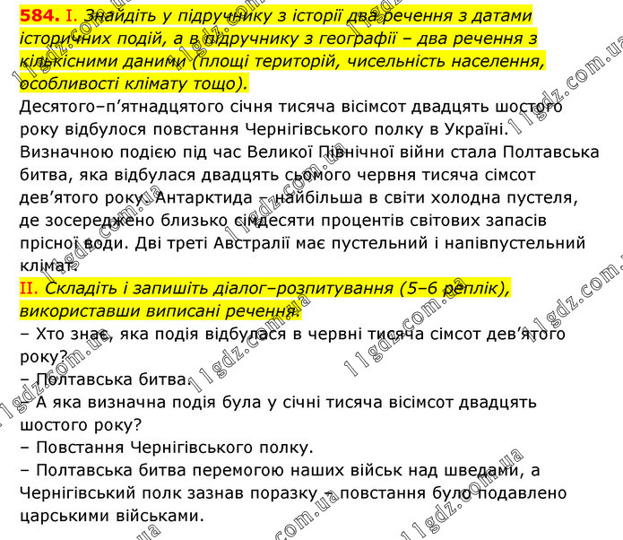 І. Знайдіть у підручнику з історії два речення з датами історичних подій, а в підручнику з географії – два речення з кількісними даними (площі територій, чисельність населення, особливості клімату тощо). Десятого–п’ятнадцятого січня тисяча вісімсот двадцять шостого року відбулося повстання Чернігівського полку в Україні. Визначною подією під час Великої Північної війни стала Полтавська битва, яка відбулася двадцять сьомого червня тисяча сімсот дев’ятого року. Антарктида – найбільша в світи холодна пустеля, де зосереджено близько сімдесяти процентів світових запасів прісної води. Дві треті Австралії має пустельний і напівпустельний клімат. II. Складіть і запишіть діалог–розпитування (5–6 реплік), використавши виписані речення. – Хто знає, яка подія відбулася в червні тисяча сімсот дев’ятого року? – Полтавська битва. – А яка визначна подія була у січні тисяча вісімсот двадцять шостого року? – Повстання Чернігівського полку. – Полтавська битва перемогою наших військ над шведами, а Чернігівський полк зазнав поразку – повстання було подавлено царськими військами.