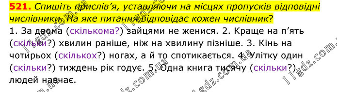 Спишіть прислів’я, уставляючи на місцях пропусків відповідні числівники. На яке питання відповідає кожен числівник? 1. За двома (скількома?) зайцями не женися. 2. Краще на п’ять (скільки?) хвилин раніше, ніж на хвилину пізніше. 3. Кінь на чотирьох (скількох?) ногах, а й то спотикається. 4. Улітку один (скільки?) тиждень рік годує. 5. Одна книга тисячу (скільки?) людей навчає.