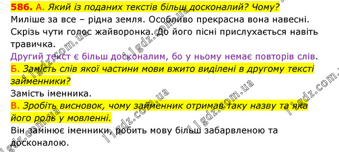 А. Який із поданих текстів більш досконалий? Чому? Миліше за все – рідна земля. Особливо прекрасна вона навесні. Скрізь чути голос жайворонка. До його пісні прислухається навіть травичка. Другий текст є більш досконалим, бо у ньому немає повторів слів. Б. Замість слів якої частини мови вжито виділені в другому тексті займенники? Замість іменника. В. Зробіть висновок, чому займенник отримав таку назву та яка його роль у мовленні. Він замінює іменники, робить мову більш забарвленою та досконалою.