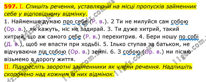 І. Спишіть речення, уставляючи на місці пропусків займенник себе у відповідному відмінку. 1. Найменше думаю про себе (Р. в.). 2 Ти не милуйся сам собою (Ор. в.), як кажуть, ніс не задирай. 3. Ти дуже хитрий, такий хитрий, що аж самого себе (Р. в.) перехитрив. 4. Бери ношу по собі (Д. в.), щоб не впасти при ходьбі. 5. Ілько ступав за батьком, не відчуваючи під собою (Ор. в.) землі. 6. З собою (Ор. в.) ми пісню візьмемо в дорогу життя. II. Підкресліть зворотні займенники як члени речення. Надпишіть скорочено над кожним із них відмінок.
