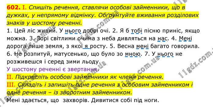 І. Спишіть речення, ставлячи особові займенники, що в дужках, у непрямому відмінку. Обґрунтуйте вживання розділових знаків у шостому реченні. 1. Цей ліс живий. У нього добрі очі. 2. Я б тобі пісню приніс, якщо можна. 3. Зорі світлими очима з неба дивляться на нас. 4. Мені дорога лише земля, з якої я росту. 5. Весна мені багато говорила. 6. Не розпитуй, матусенько, що було зо мною. 7. У нього не розживешся і серед зими льоду. У шостому реченні є звертання. II. Підкресліть особові займенники як члени речення. III. Складіть і запишіть одне речення з особовим займенником і одне речення – із зворотним займенником. Мені здається, що захворів. Дивитися собі під ноги.