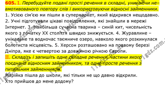 І. Перебудуйте подані прості речення в складні, уникаючи не– вмотивованого повтору слів і використовуючи відносні займенники. 1. Усією сім’єю ми пішли в супермаркет, який відкрився нещодавно. 2. Учні підготували цікаві повідомлення, які знайшли в мережі Інтернет. 3. Найбільша сучасна тварина – синій кит, чисельність якого з початку XX століття швидко знижується. 4. Журавлине – унікальне та водночас таємниче озеро, навколо якого розкинулася болотиста місцевість. 5. Херсон розташовано на правому березі Дніпра, яке є четвертою за довжиною річкою Європи. ІІ. Складіть і запишіть одне складне речення, частини якого поєднано відносним займенником, та одне просте речення з питальним займенником. Марійка пішла до школи, які тільки не що давно відкрили. Хто прийшов до мене додому?